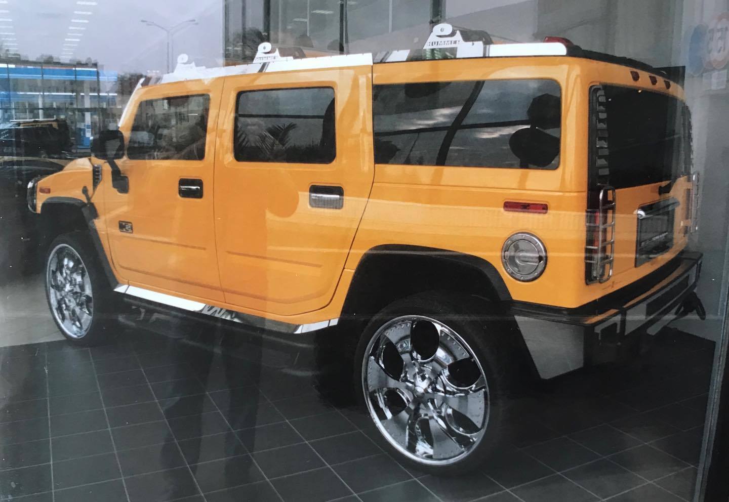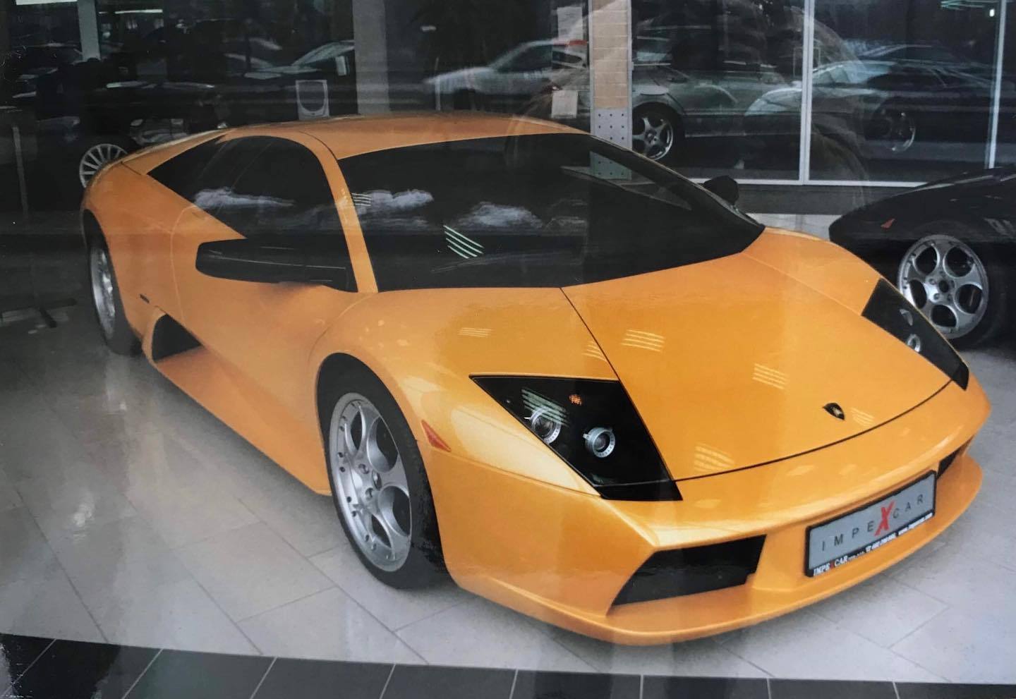 Legendární supersport nultých let LAMBORGHINI MURCIÉLAGO a SUV HUMMER H2 vystavené v salonu IMPEX CAR, sídlící svého času na ulici 5. května, poblíž benziny OMV, ve směru do centra Prahy.