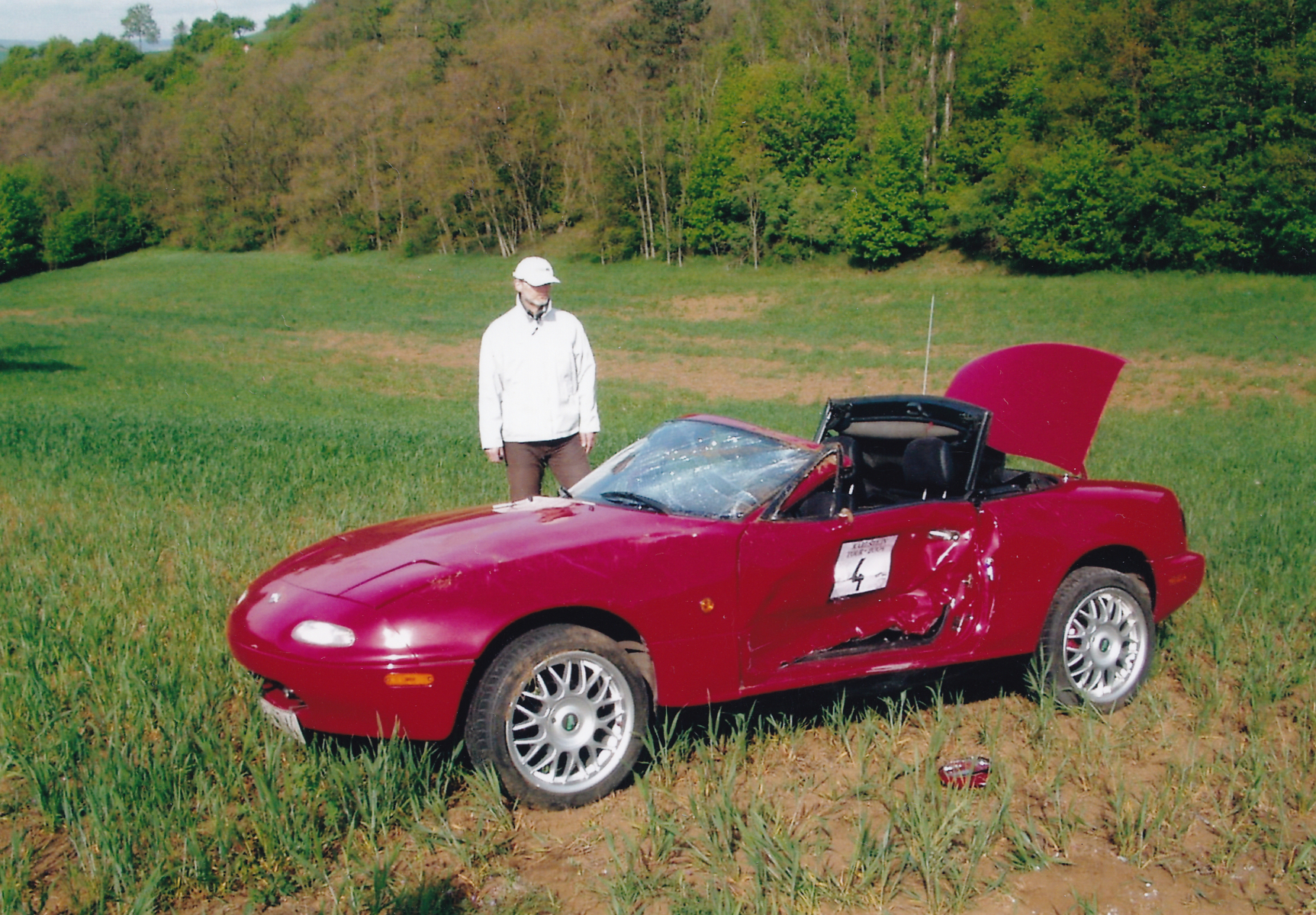 To ale není vše… Na srazu vyletěla z cesty další, červená MX-5 se startovním číslem 4.