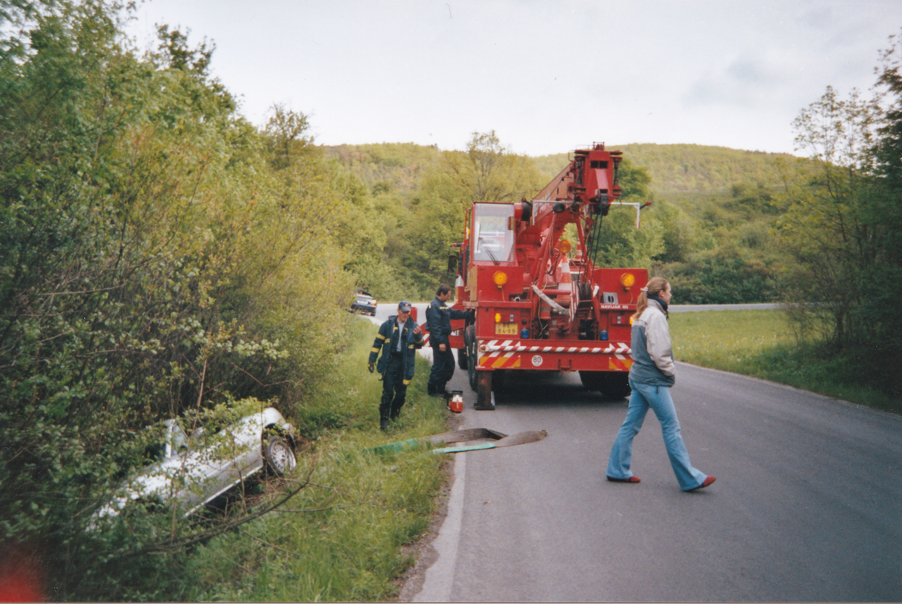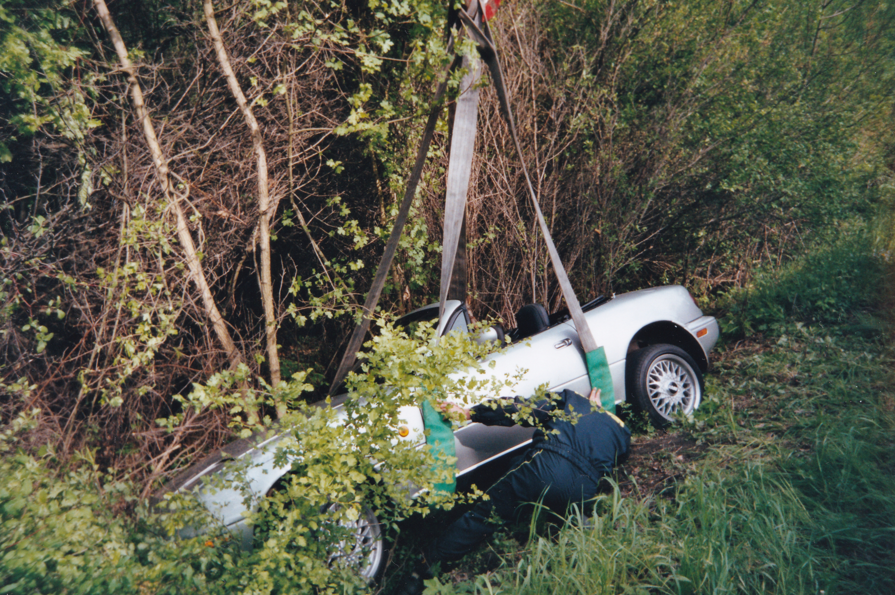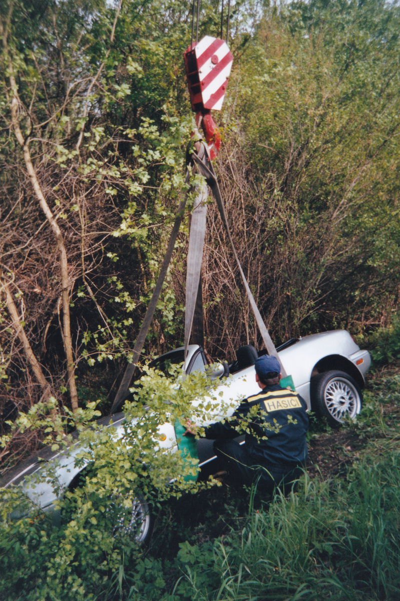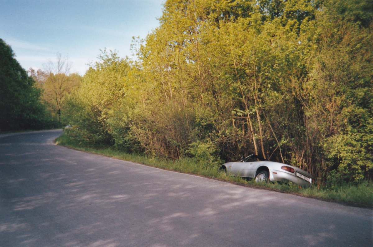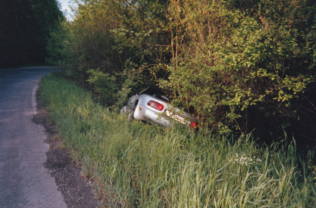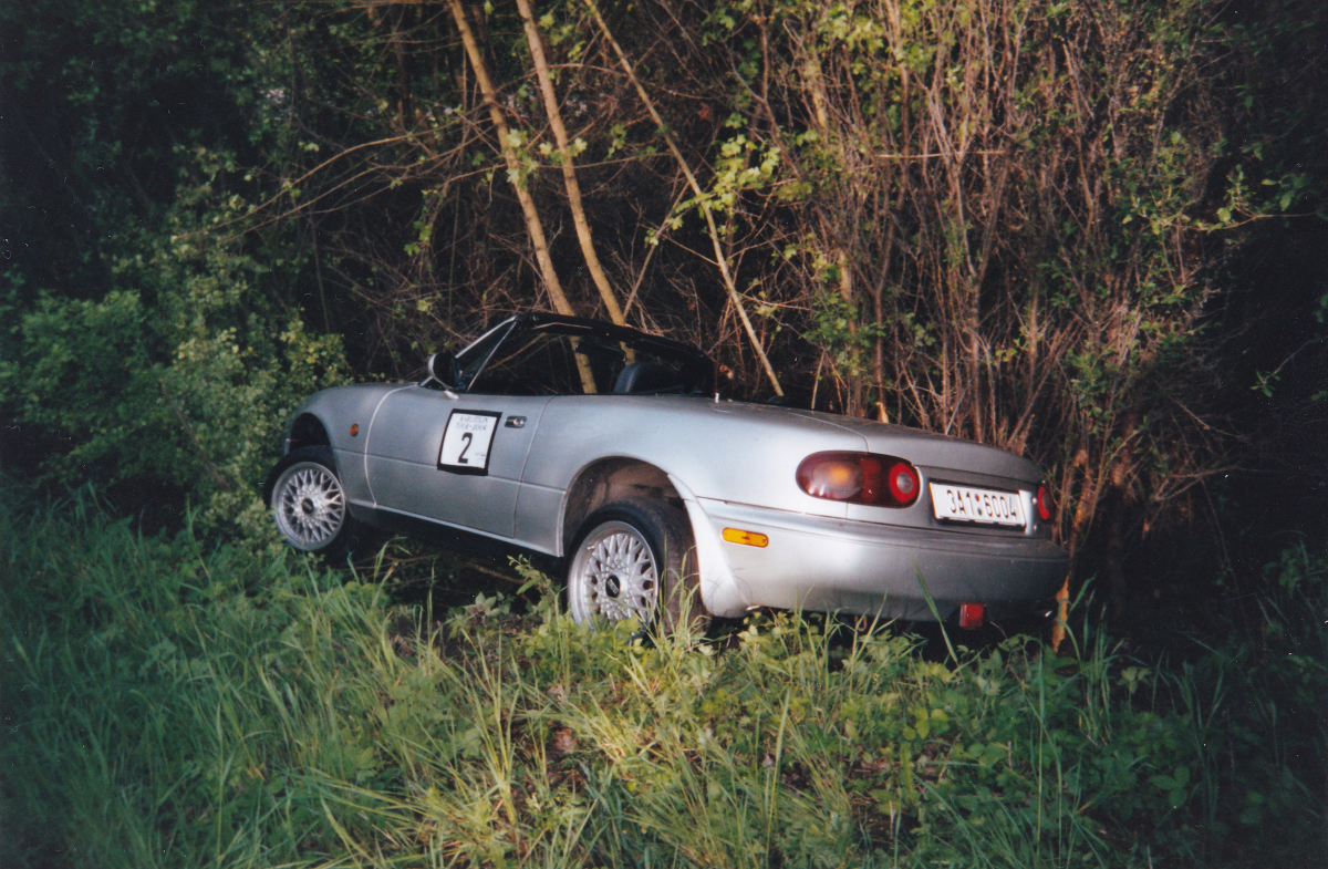 Tehdy se rozhodli, že si udělají „závod“ a stříbrná MX-5 se startovním číslem 2 skončila mimo „trať.“ Rychle volali hasiče s nervy, kolik tisíc bude vytáhnutí stát. K překvapení pořadatelů si hasiči řekli směšných 800 Kč! Stříbrná MX-5 se následně opravila a přelakovala na žluto.